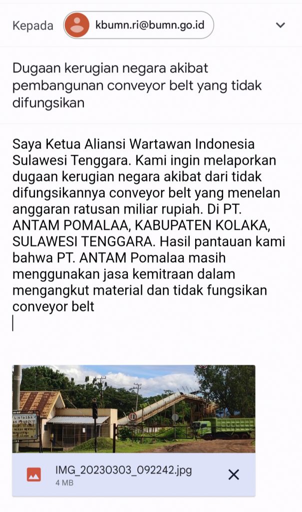 Terkait informasi tersebut, UNews mendatangi kantor Antam Pomalaa, untuk mengkonfirmasi kebenaran informasi itu. Kamis, 2 Maret 2023. Pihak antam saat itu belum bisa ditemui. UNews kemudian mendatangi lokasi terdekat dimana Conveyor Belt dapat terlihat untuk mengetahui apakah alat tersebut difungsikan atau tidak seperti informasi yang diterima.